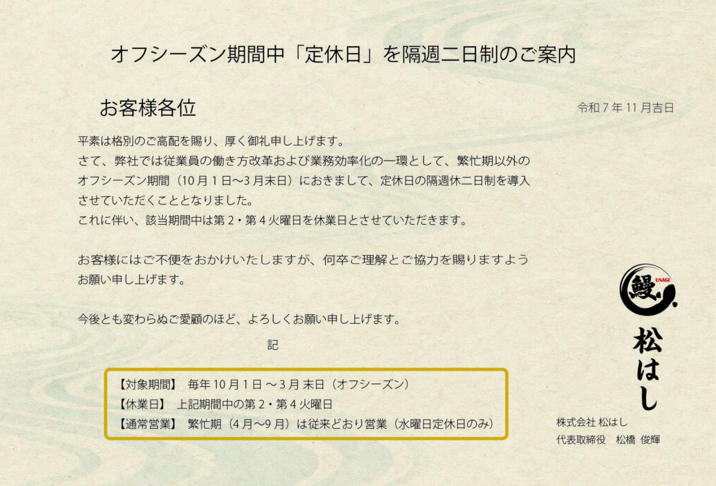 働き方改革の一環として「オフシーズン」定休日変更のお知らせ