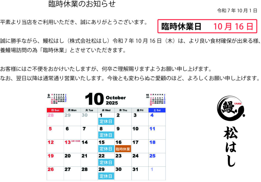 養鰻所訪問の為『臨時休業』のお知らせ!