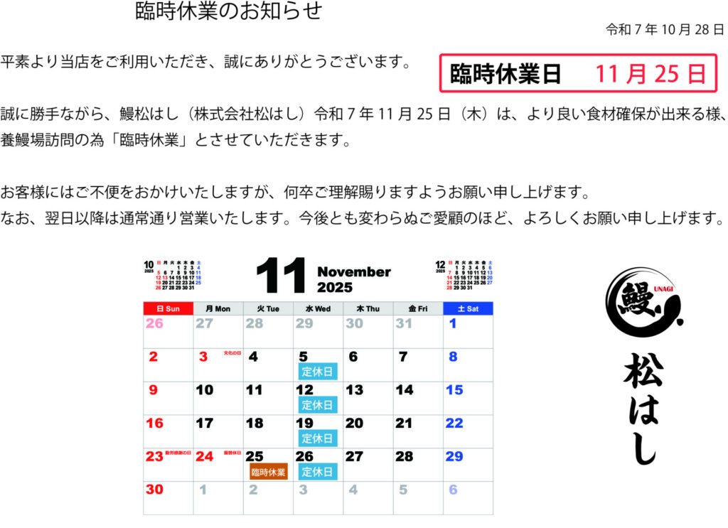 11月25日(火)「臨時休業のお知らせ」養鰻場訪問の為