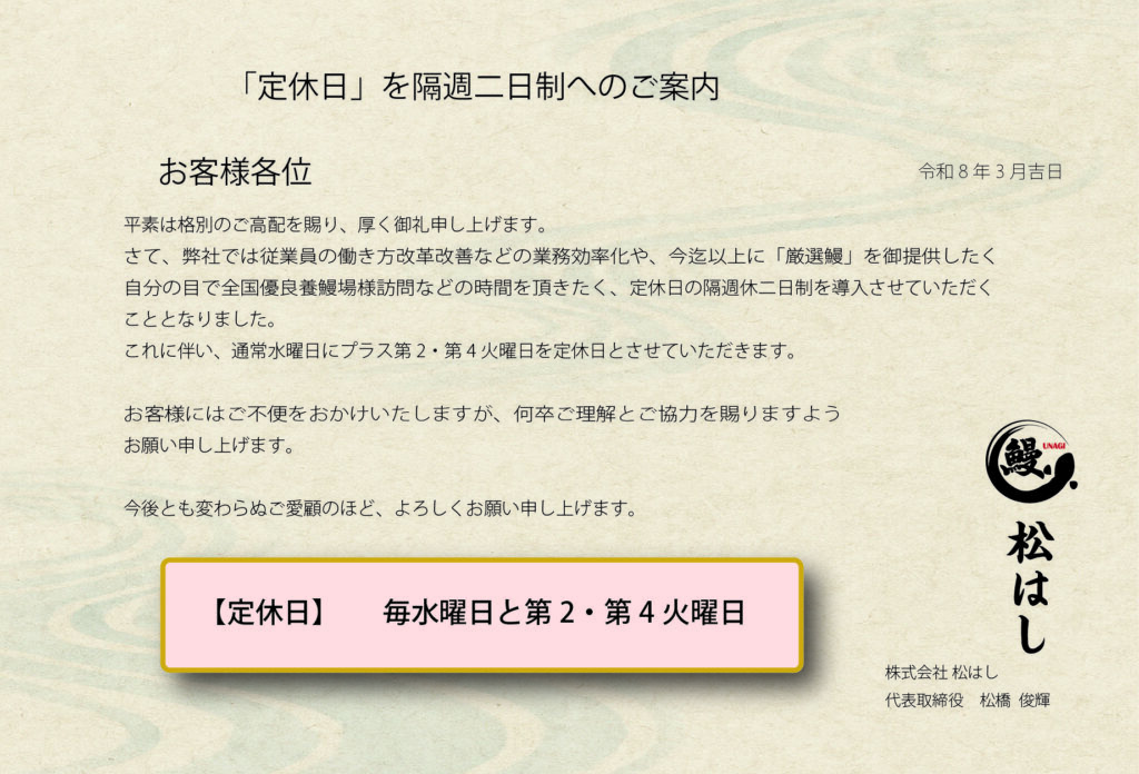 働き方改革の一環及び厳選鰻確保の為「定休日変更」のお知らせ