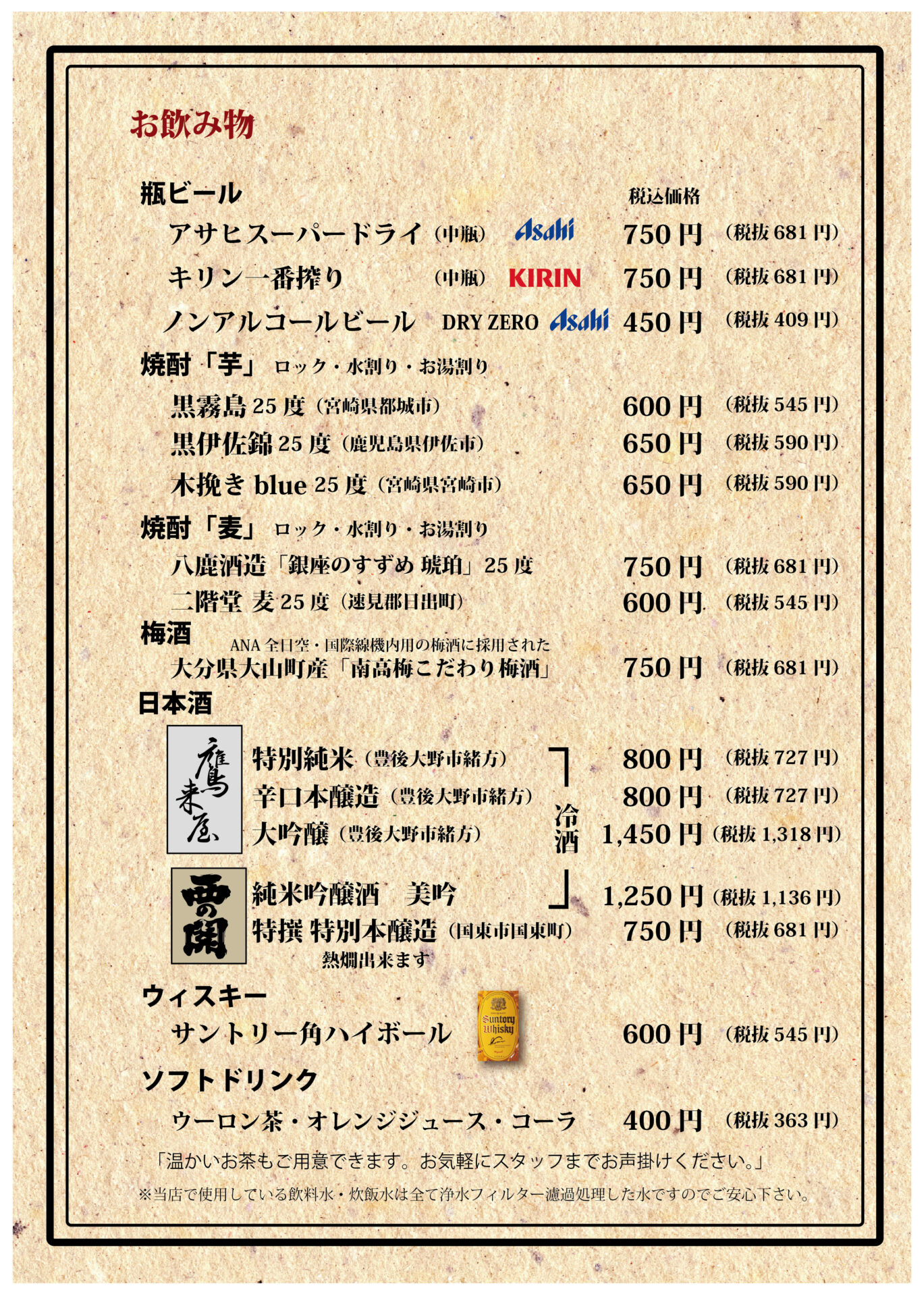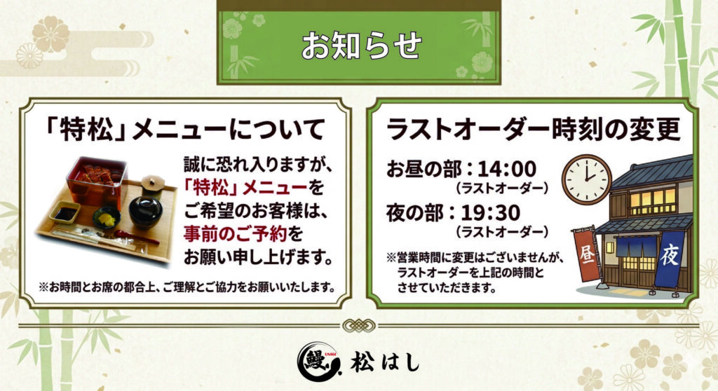 2024/7月より「ラストオーダー時間」及び「特松」メニュー変更のお知らせ